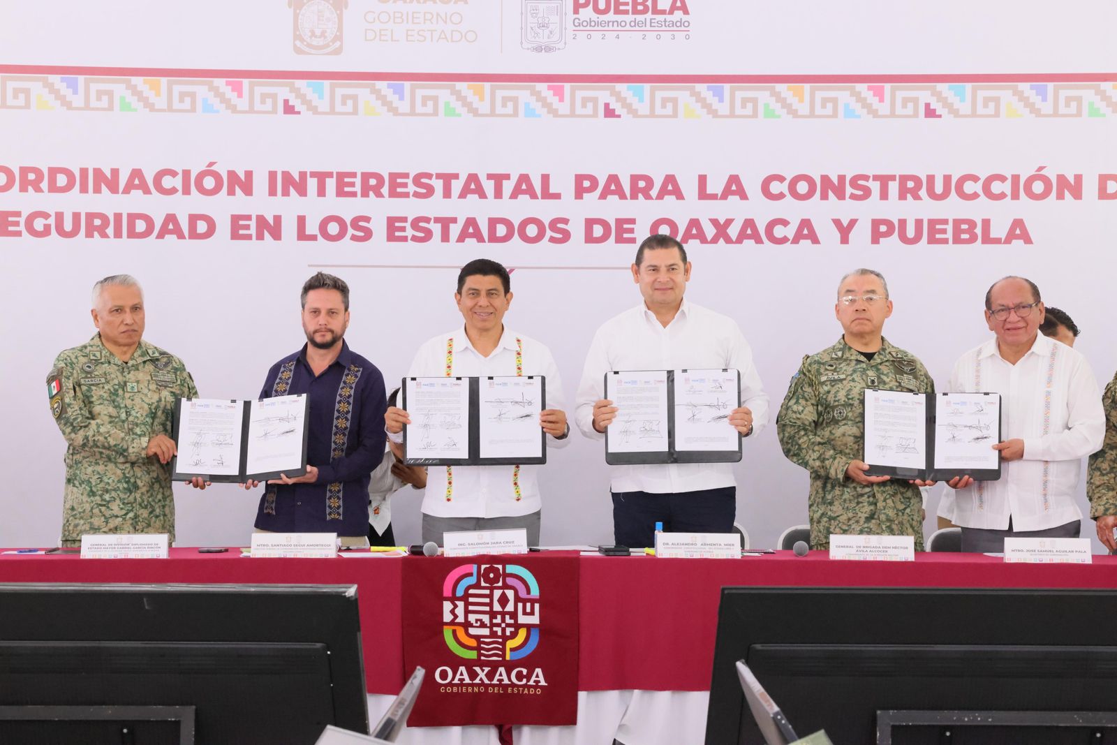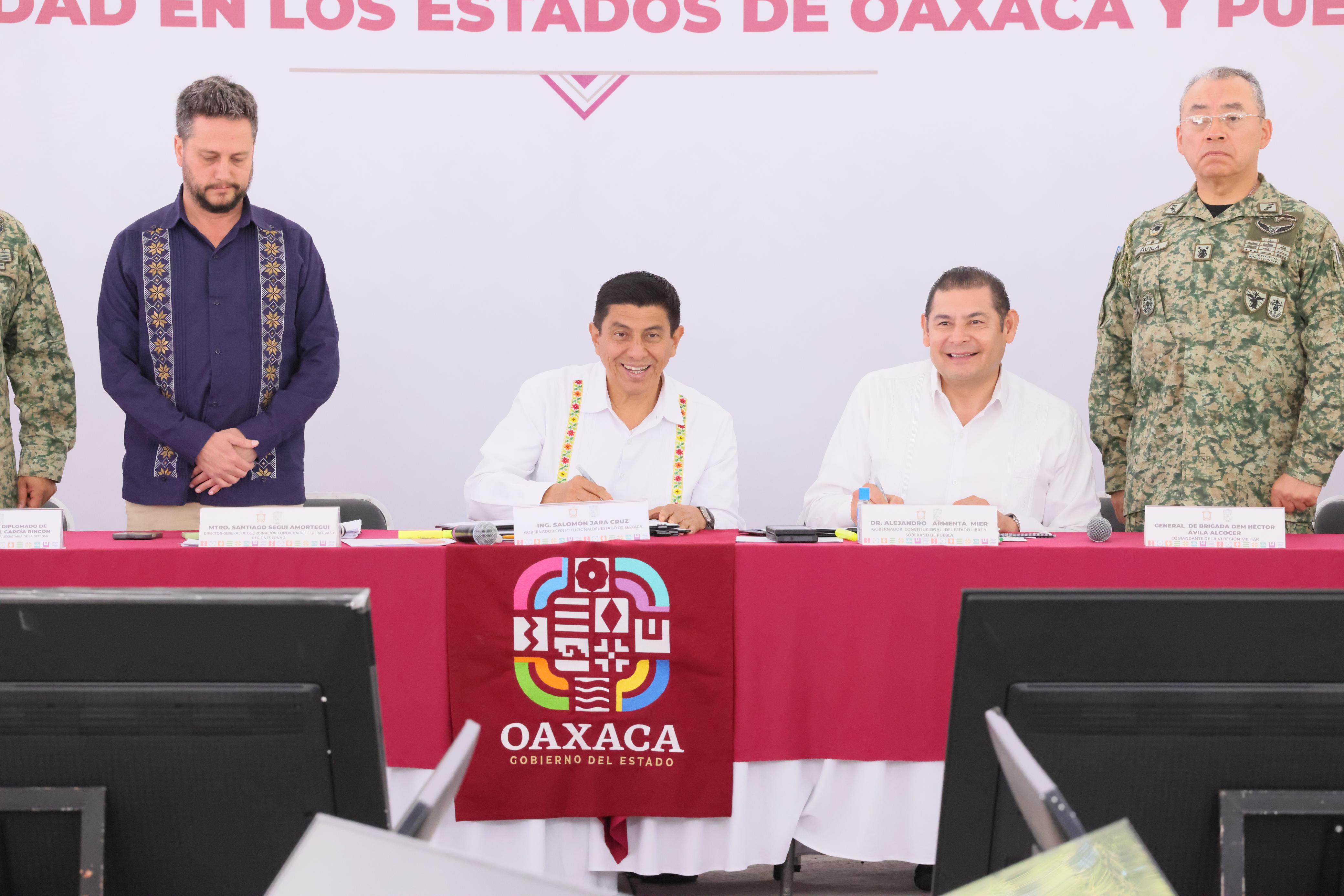 HUAJUAPAN DE LEÓN, OAX.- Para fortalecer la seguridad con eficacia y contundencia, y alineados a la Estrategia Nacional que encabeza la presidenta Claudia Sheinbaum, el gobernador de Puebla, Alejandro Armenta y el titular del ejecutivo de Oaxaca, Salomón Jara Cruz, llevaron a cabo una firma de convenio en el marco de la Reunión de Coordinación Interestatal para la Construcción de la Paz y Seguridad entre ambos estados.