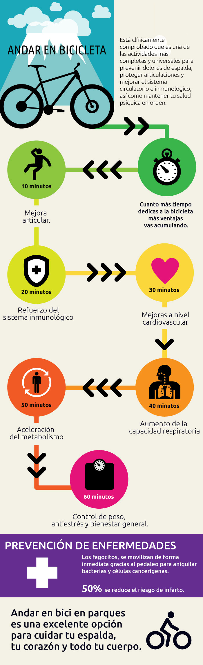 | Está clínicamente comprobado que andar en bicicleta es una de las actividades más completas y universales para prevenir dolores de espalda, proteger articulaciones y mejorar el sistema circulatorio e inmunológico, así como mantener tu salud psíquica en orden. |
