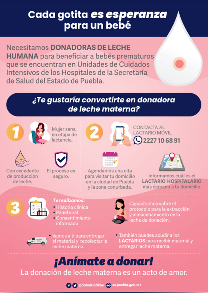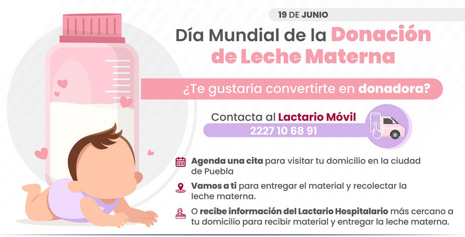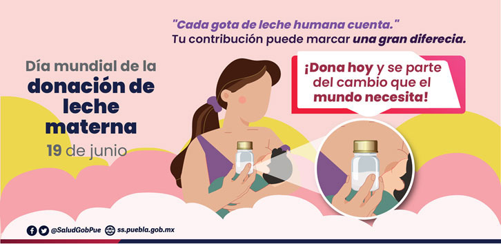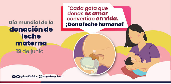 Los Servicios de Salud del Estado de Puebla, pertenecientes a la Red Mexicana de Bancos de Leche Humana, como integrante de la Red Global de Bancos de Leche Humana, se suman a la conmemoración del Día Mundial de la Donación de Leche Humana, con el objetivo de promover la donación de leche materna para favorecer la óptima alimentación de los recién nacidos prematuros y enfermos hospitalizados que por diversas razones no pueden recibir leche materna directamente de sus madres.