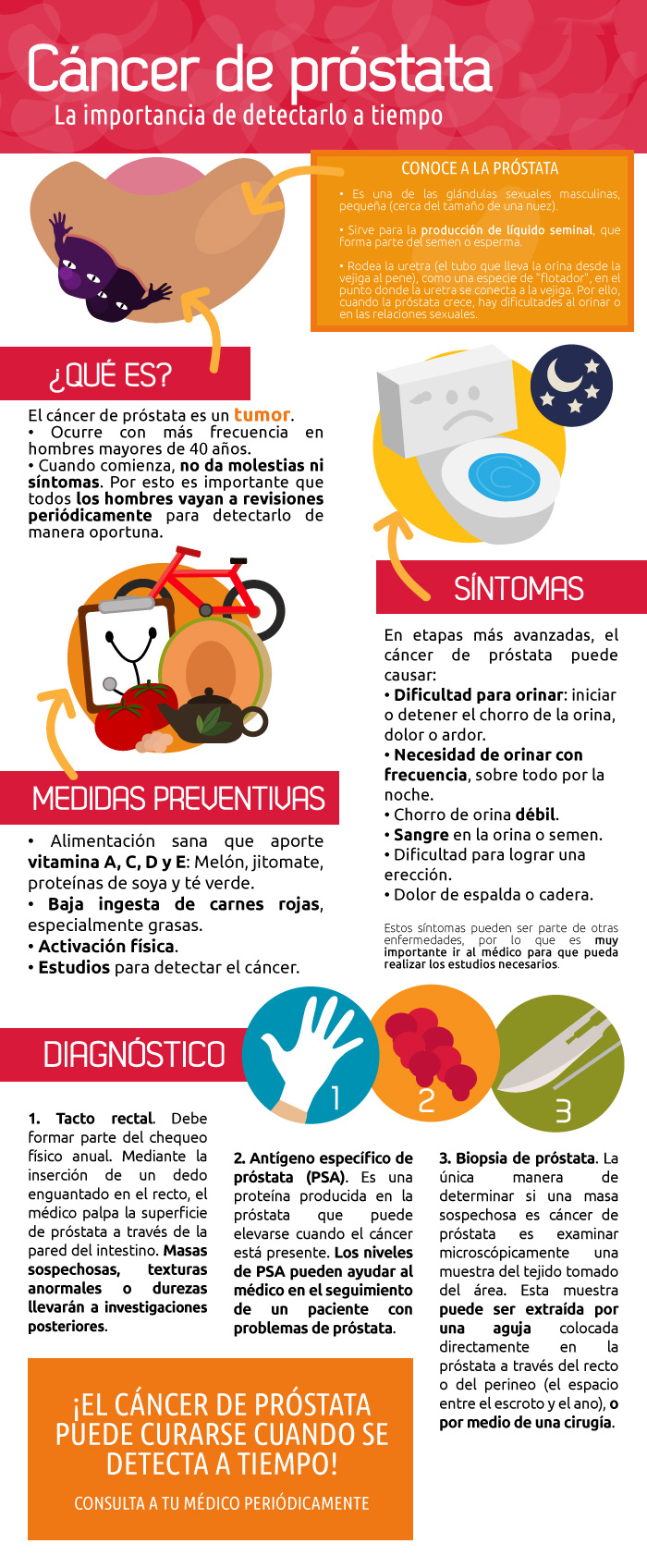 | El cáncer de próstata es un tumor que ocurre con más frecuencia en hombres mayores de 40 años. Cuando comienza, no da molestias ni síntomas. Por esto es importante que todos los hombres vayan a revisiones periódicamente para detectarlo de manera oportuna. |