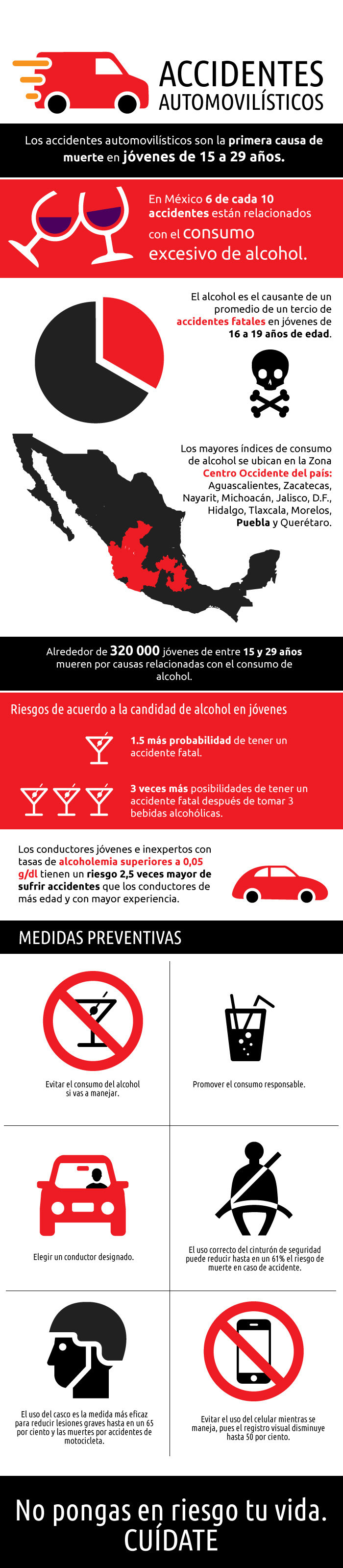 En México se registran 16 mil muertes al año por accidentes de tránsito, un millón de lesionados, 40 mil personas con discapacidad permanente y constituyen costos por 150 mil millones de pesos. Los accidentes son la primera causa de muerte en personas jóvenes a nivel mundial. Sin embargo, alrededor del 90% de ellos pueden ser prevenidos si se toman sencillas precauciones, como usar el cinturón de seguridad, no manejar en estado de ebriedad y no utilizar el celular mientras se maneja.